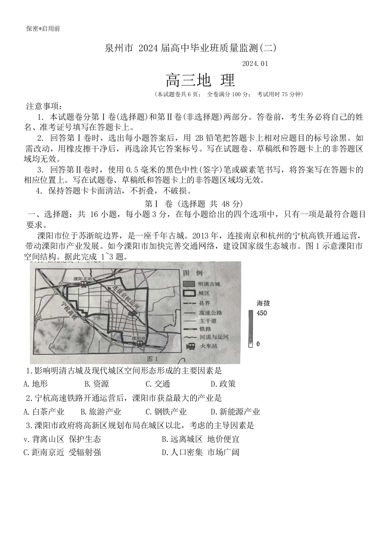 福建省泉州市2024届高中高三上学期毕业班质量监测(二)地理