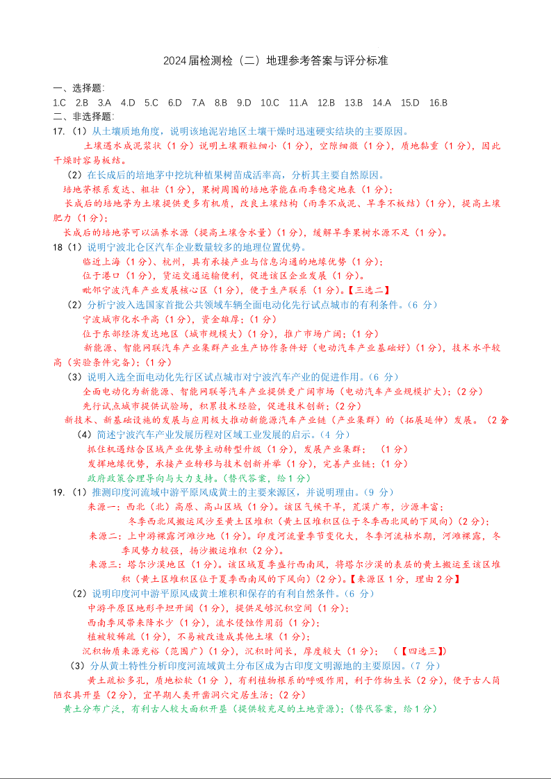 福建省泉州市2024届高中高三上学期毕业班质量监测(二)地理答案