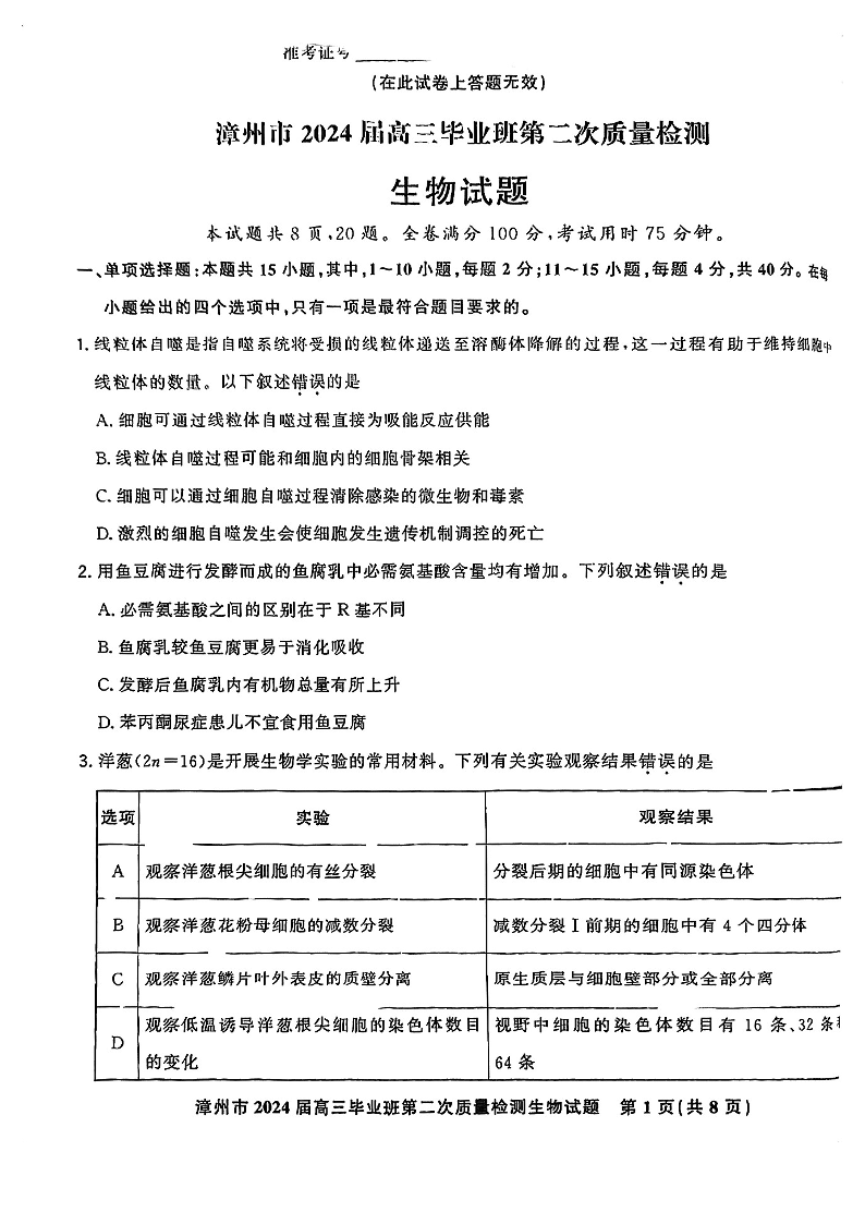 福建省漳州市2024届高三上学期第二次质量检测生物+答案