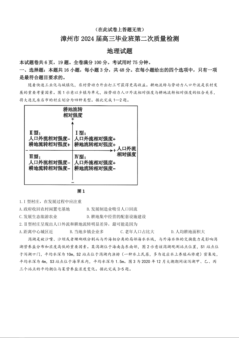 福建省漳州市2024届高三上学期第二次质量检测地理+答案