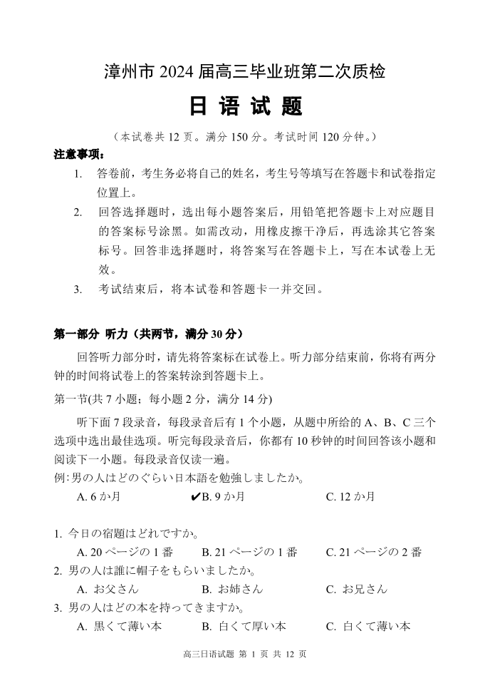 福建省漳州市2024届高三上学期第二次质量检测日语