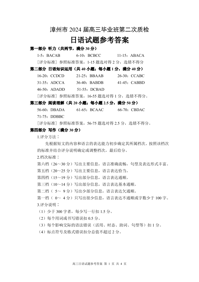 福建省漳州市2024届高三上学期第二次质量检测日语答案