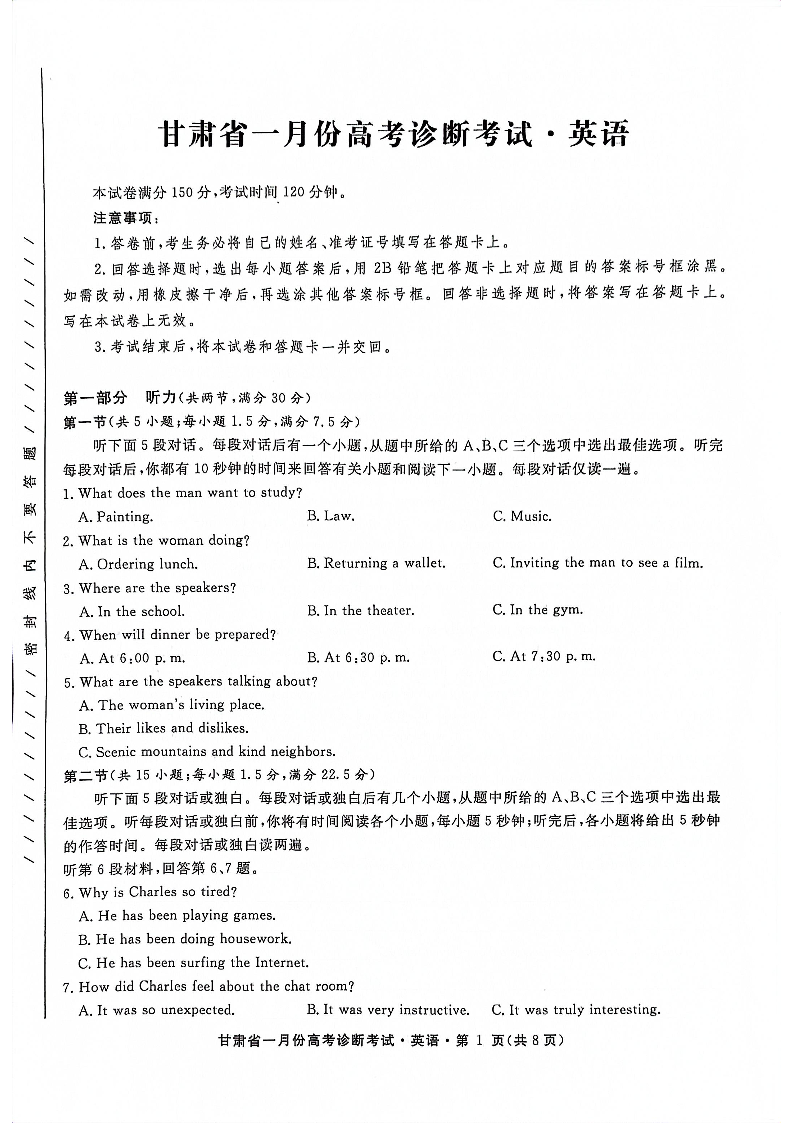 甘肃省2024届高三上学期1月份高考诊断考试(甘肃一诊)英语