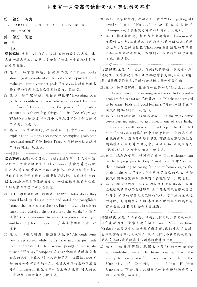 甘肃省2024届高三上学期1月份高考诊断考试(甘肃一诊)英语答案