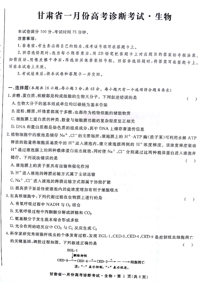 甘肃省2024届高三上学期1月份高考诊断考试(甘肃一诊)生物