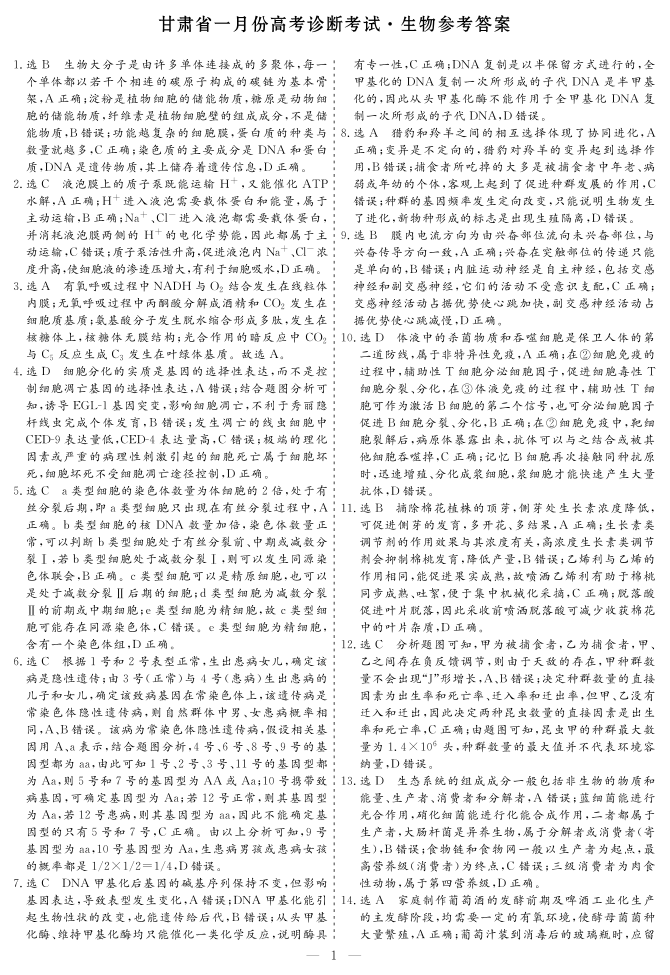 甘肃省2024届高三上学期1月份高考诊断考试(甘肃一诊)生物答案