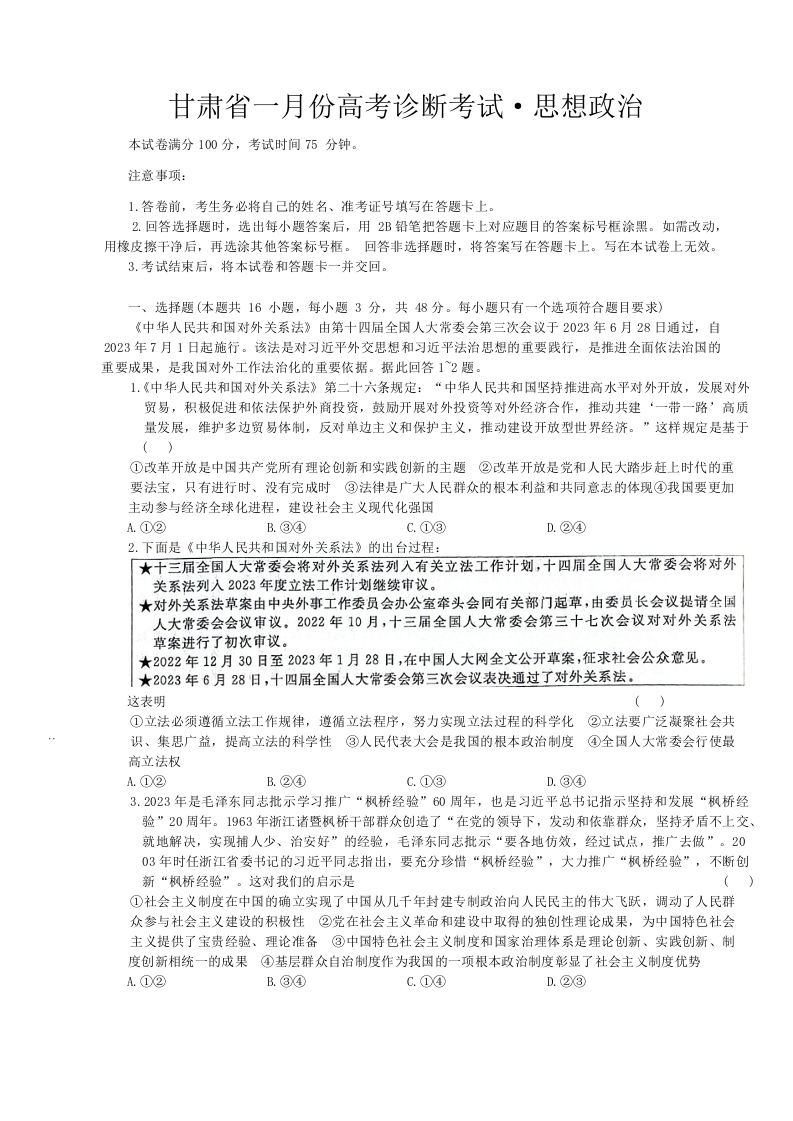 甘肃省2024届高三上学期1月份高考诊断考试(甘肃一诊)政治