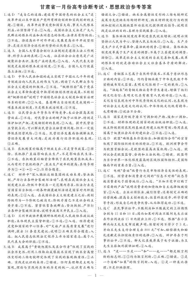 甘肃省2024届高三上学期1月份高考诊断考试(甘肃一诊)政治答案