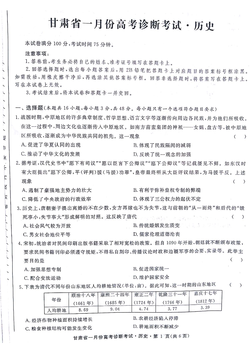 甘肃省2024届高三上学期1月份高考诊断考试(甘肃一诊)历史+答案