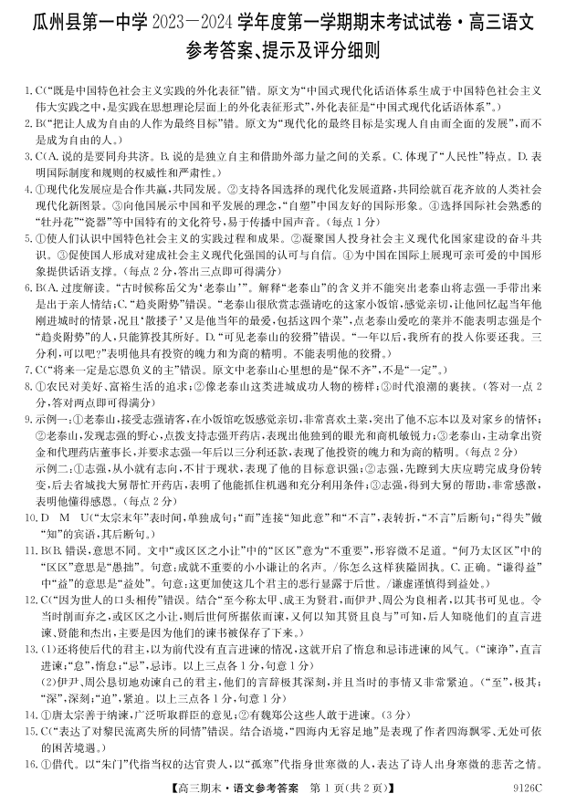 甘肃省酒泉市瓜州县第一中学2024届高三上学期1月期末考试语文答案