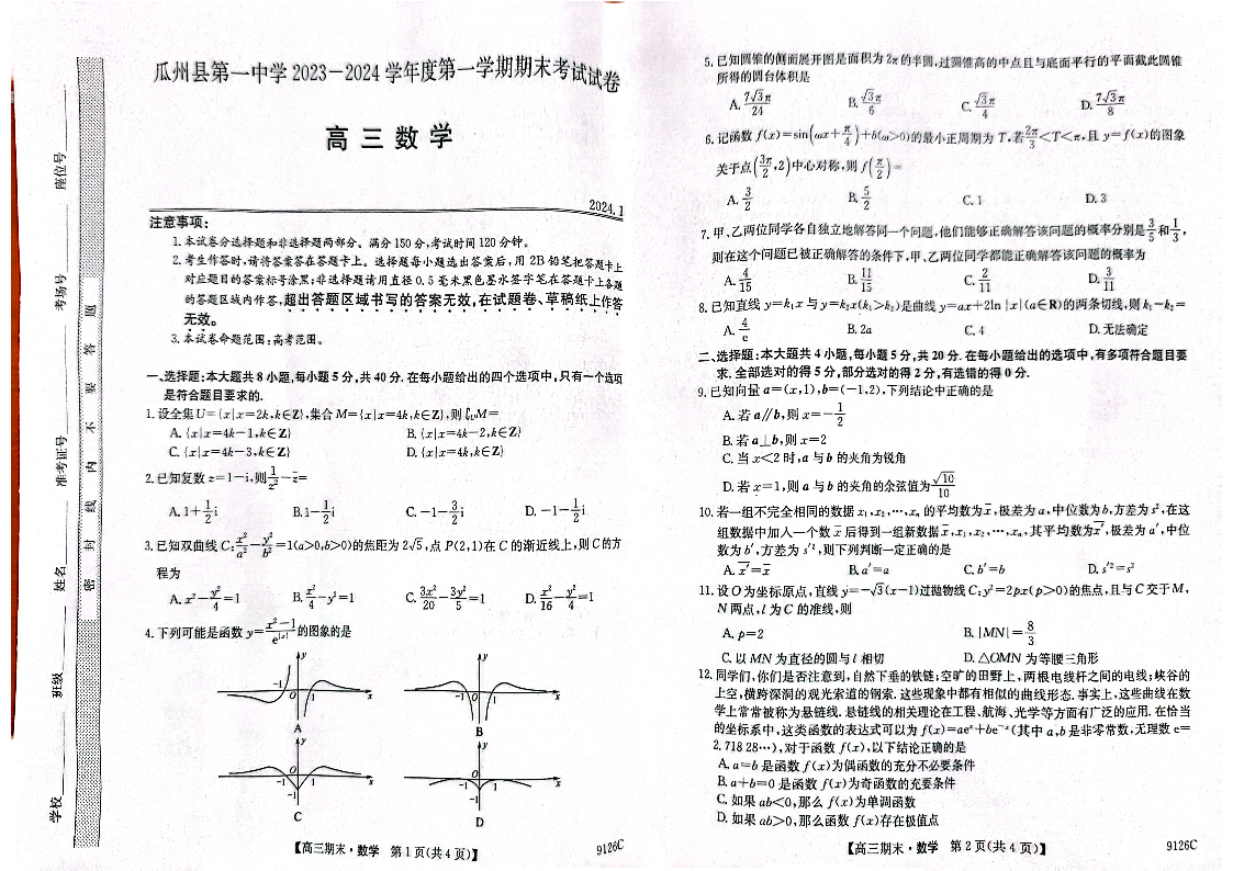 甘肃省酒泉市瓜州县第一中学2024届高三上学期1月期末考试数学