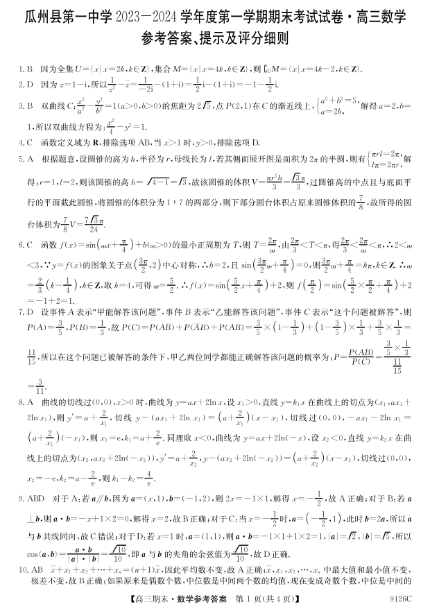 甘肃省酒泉市瓜州县第一中学2024届高三上学期1月期末考试数学答案