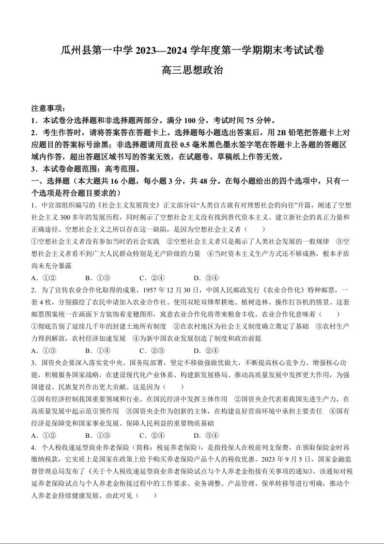 甘肃省酒泉市瓜州县第一中学2024届高三上学期1月期末考试政治+答案