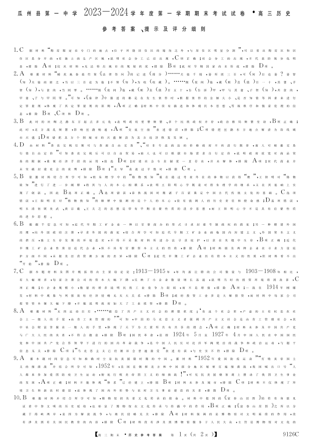 甘肃省酒泉市瓜州县第一中学2024届高三上学期1月期末考试历史答案
