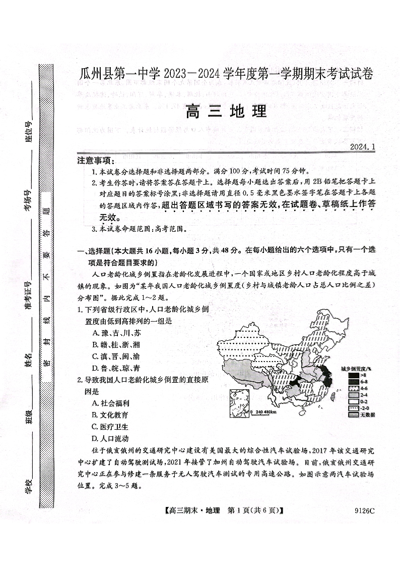 甘肃省酒泉市瓜州县第一中学2024届高三上学期1月期末考试地理