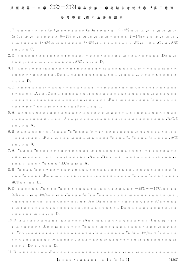 甘肃省酒泉市瓜州县第一中学2024届高三上学期1月期末考试地理答案