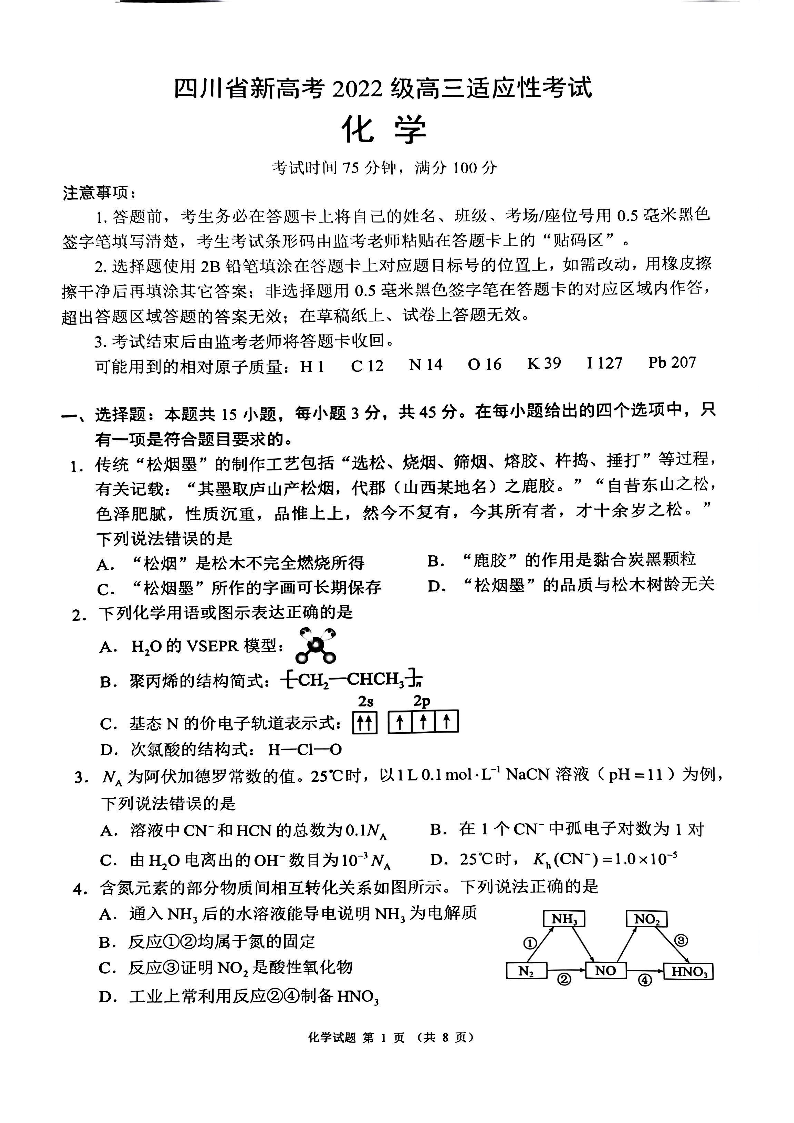 四川省蓉城名校联盟新高考2022级高三适应性考试化学