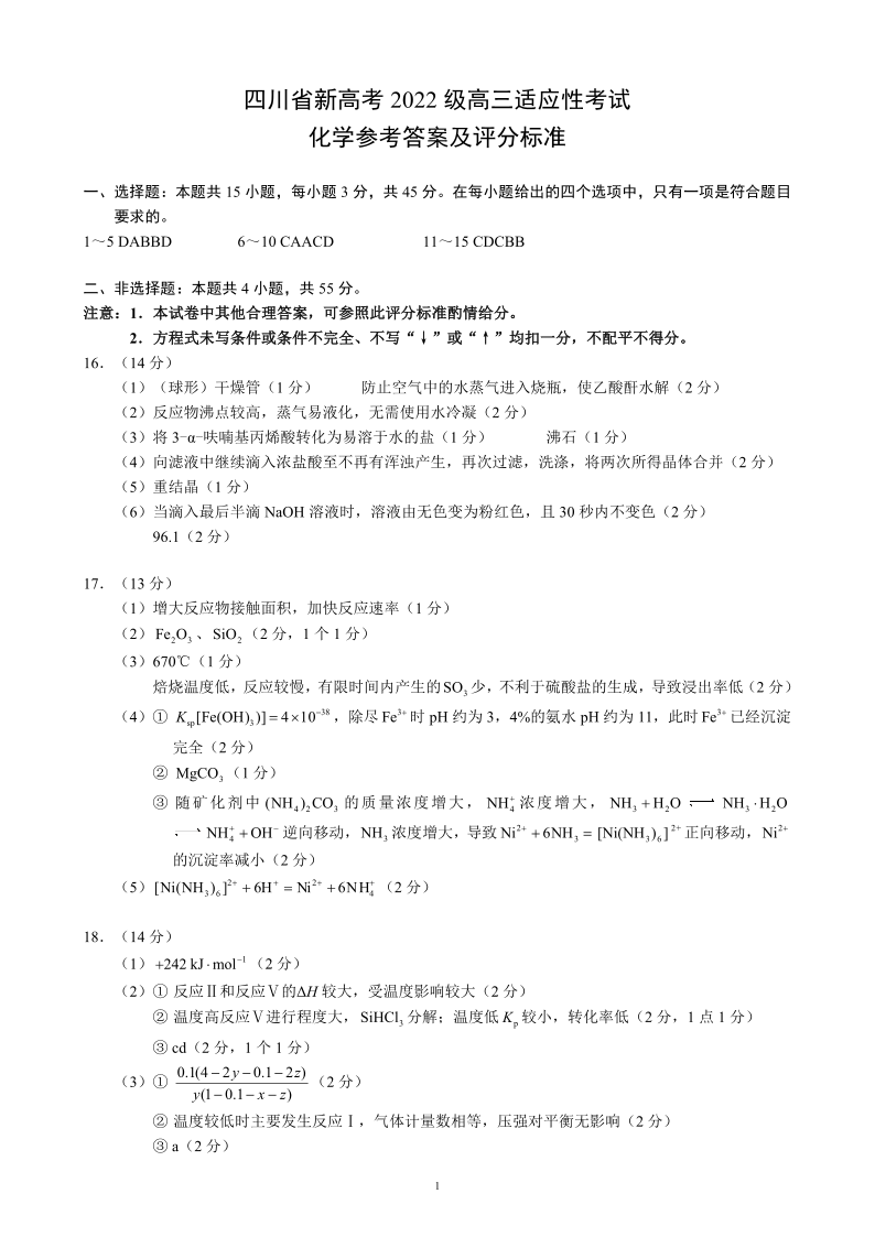 四川省蓉城名校联盟新高考2022级高三适应性考试化学答案