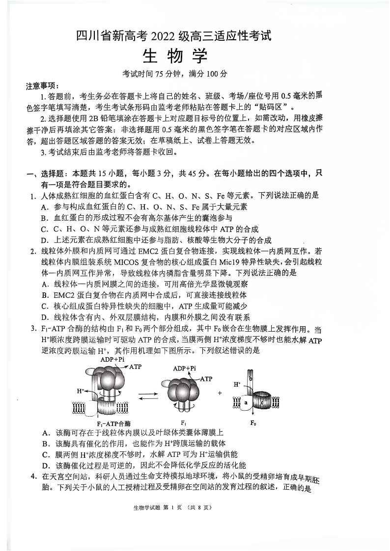 四川省蓉城名校联盟新高考2022级高三适应性考试生物