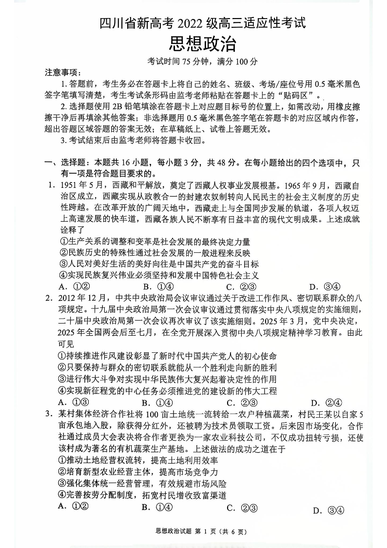 四川省蓉城名校联盟新高考2022级高三适应性考试政治