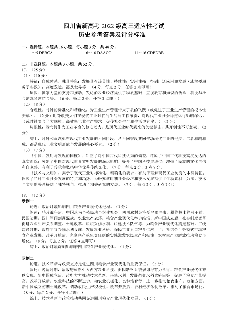 四川省蓉城名校联盟新高考2022级高三适应性考试历史答案