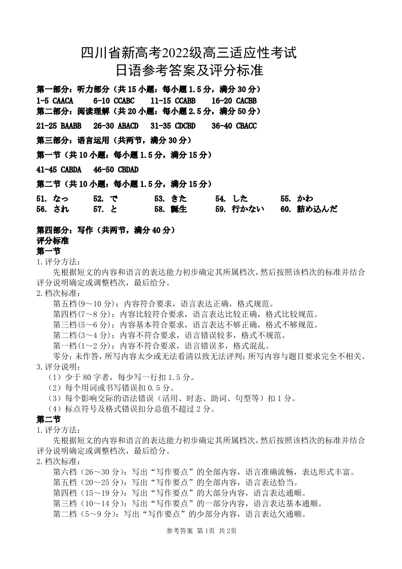 四川省蓉城名校联盟新高考2022级高三适应性考试日语答案