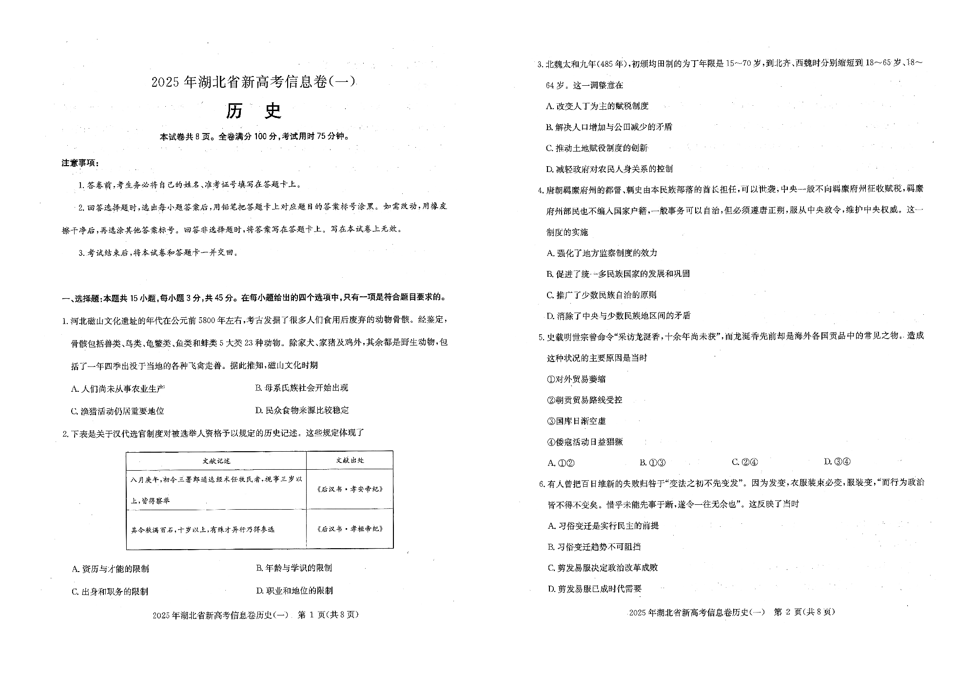2025年湖北省新高考信息卷(一)历史