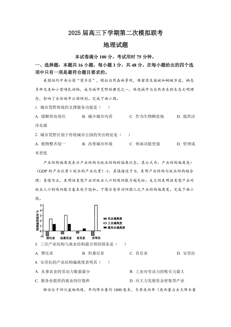河北省邢台市五县一中2025届高三下学期第二次模拟考试地理+答案
