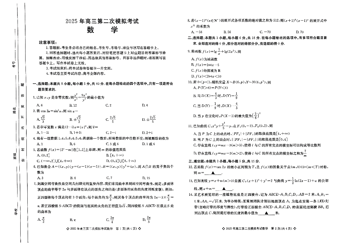 河北省保定市2025届高三第二次模拟考试数学