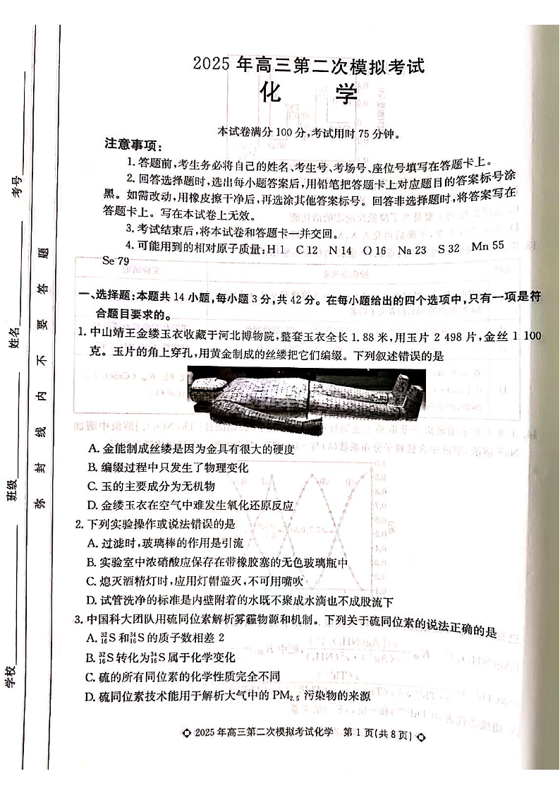 河北省保定市2025届高三第二次模拟考试化学