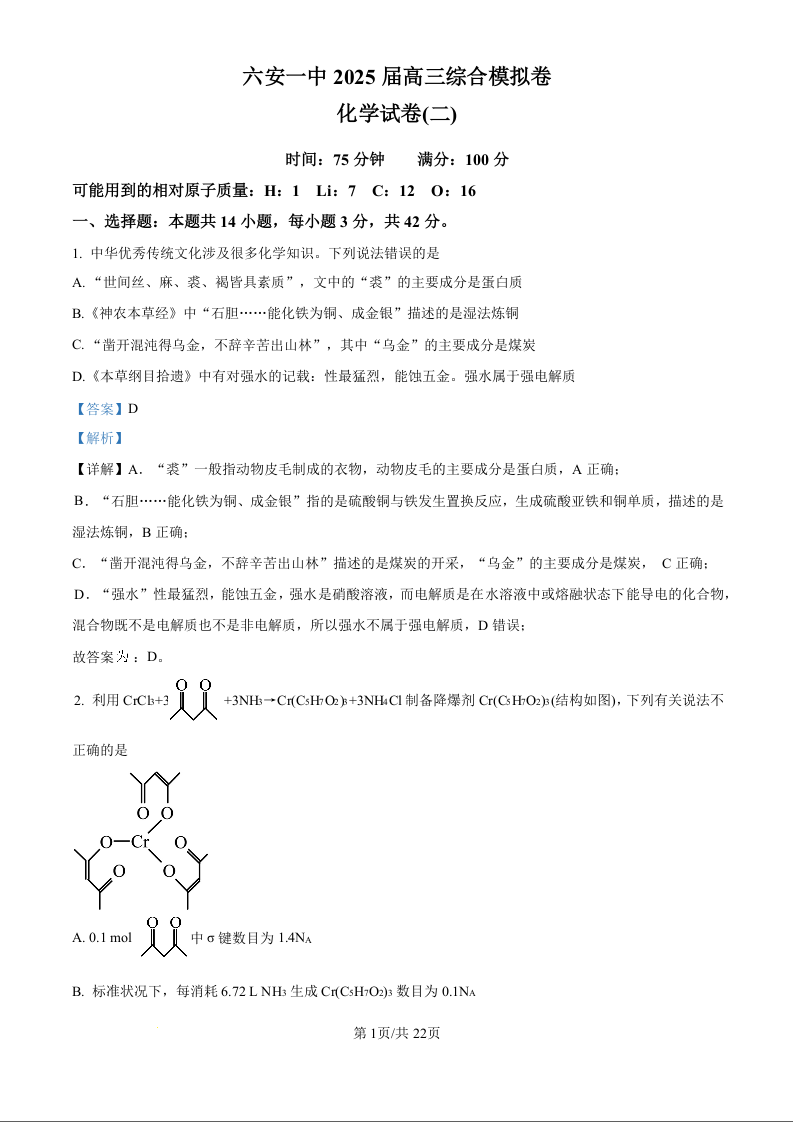安徽省六安一中2025届高三下学期模拟预测(二)化学(精品解析版)