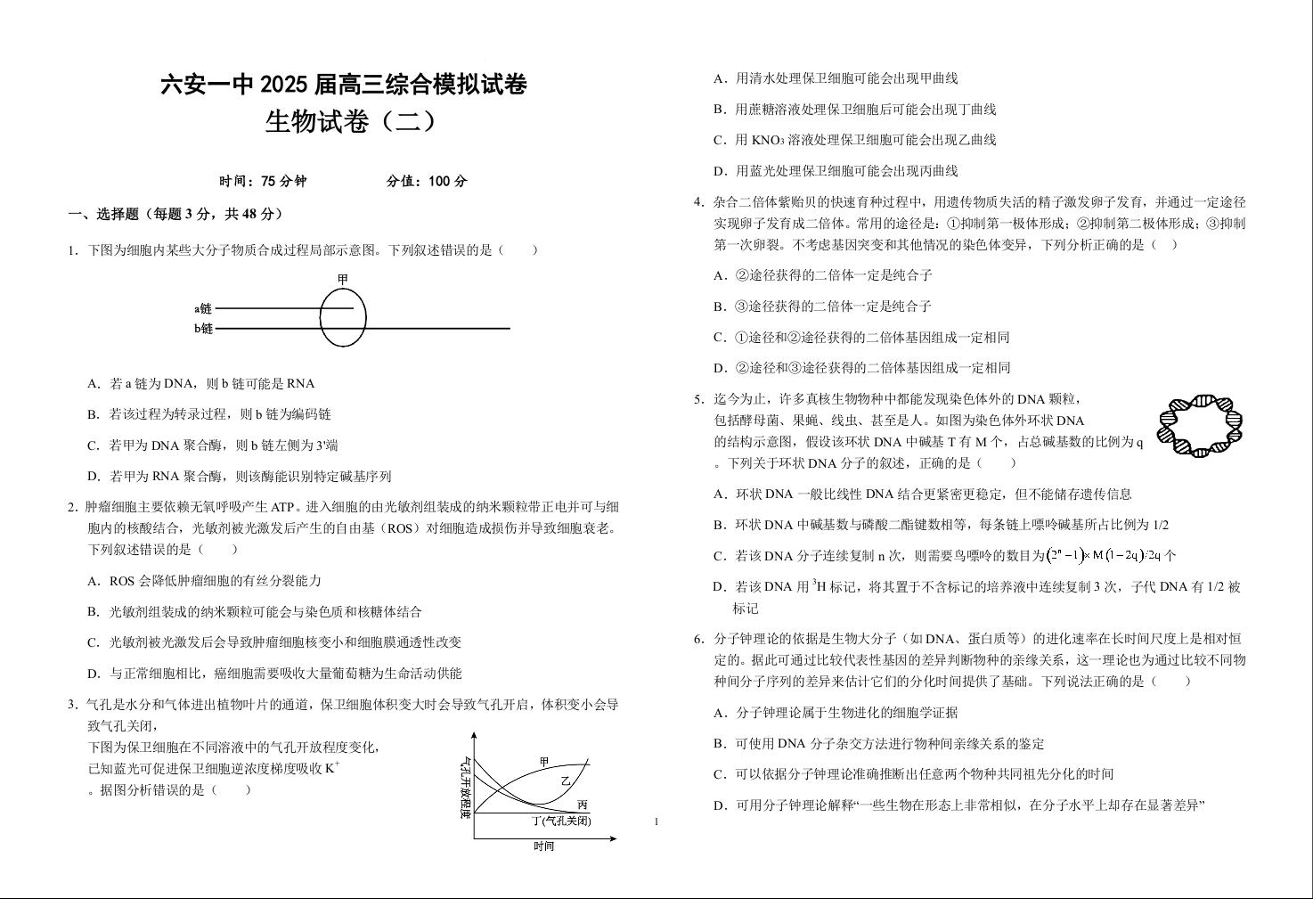 安徽省六安一中2025届高三下学期模拟预测(二)生物+答案