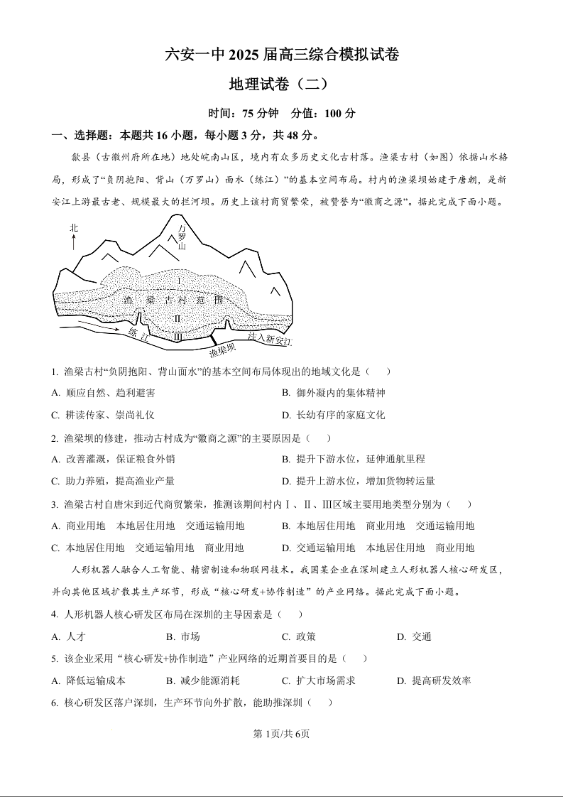 安徽省六安一中2025届高三下学期模拟预测(二)地理(原卷版)