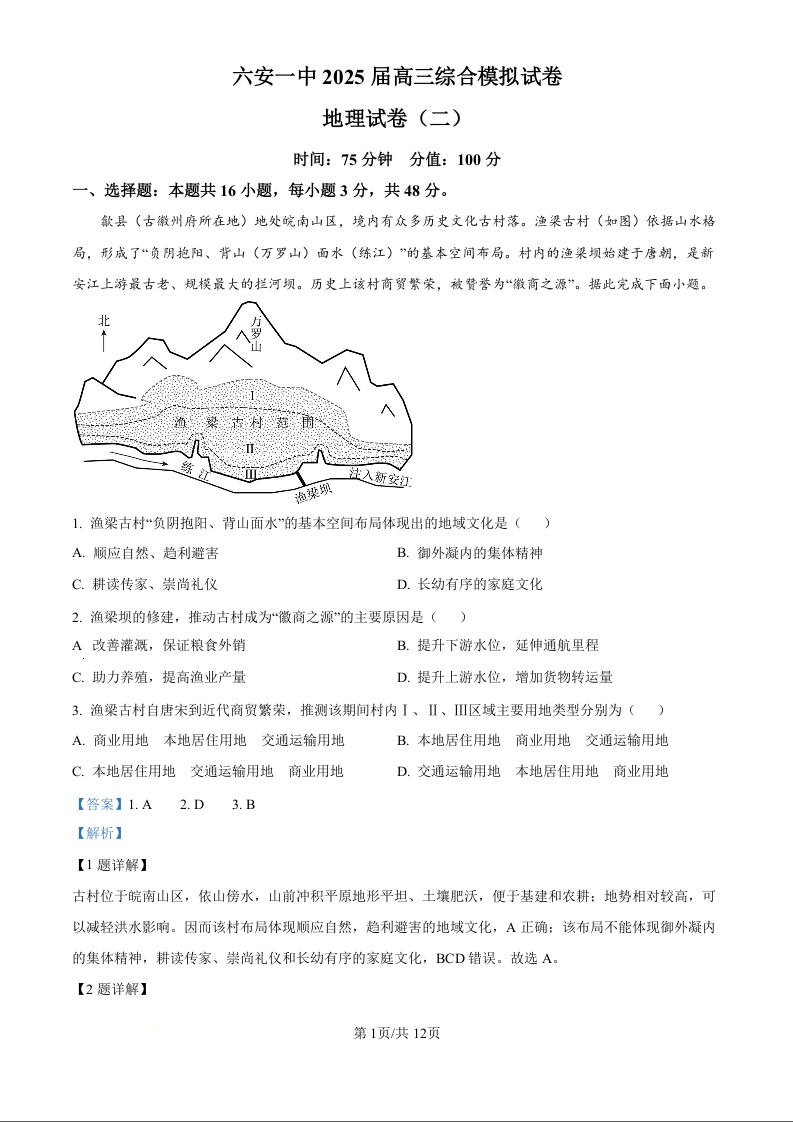 安徽省六安一中2025届高三下学期模拟预测(二)地理(精品解析版)
