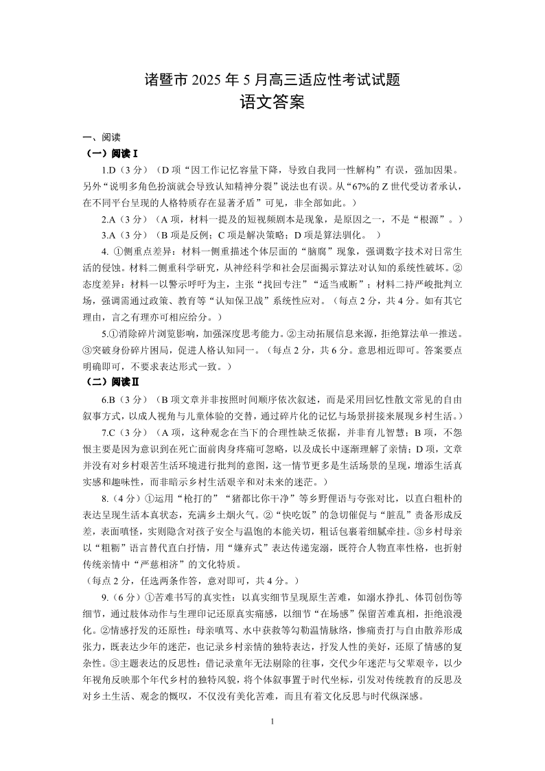 浙江省诸暨市2025年5月高三适应性考试语文答案