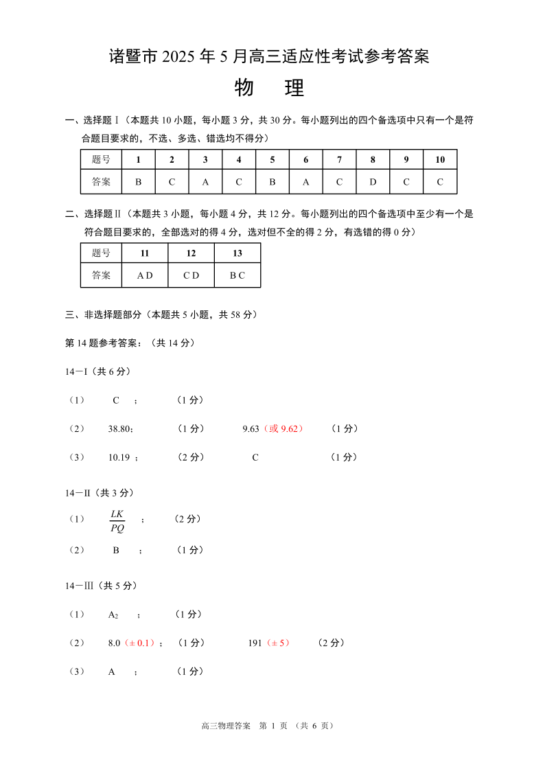 浙江省诸暨市2025年5月高三适应性考试物理答案