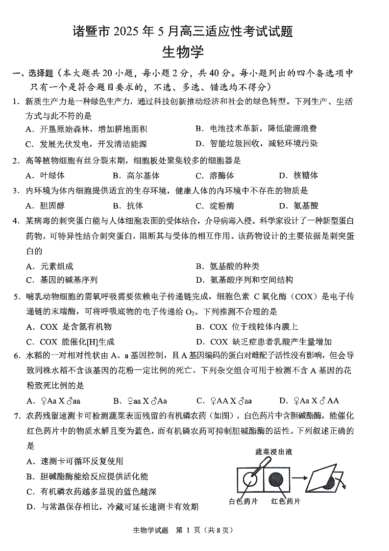 浙江省诸暨市2025年5月高三适应性考试生物