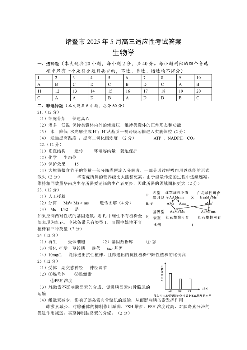 浙江省诸暨市2025年5月高三适应性考试生物答案