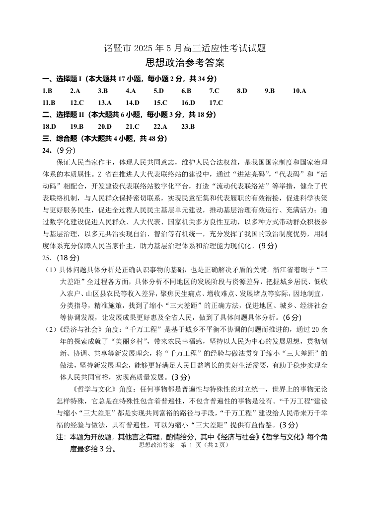 浙江省诸暨市2025年5月高三适应性考试政治答案