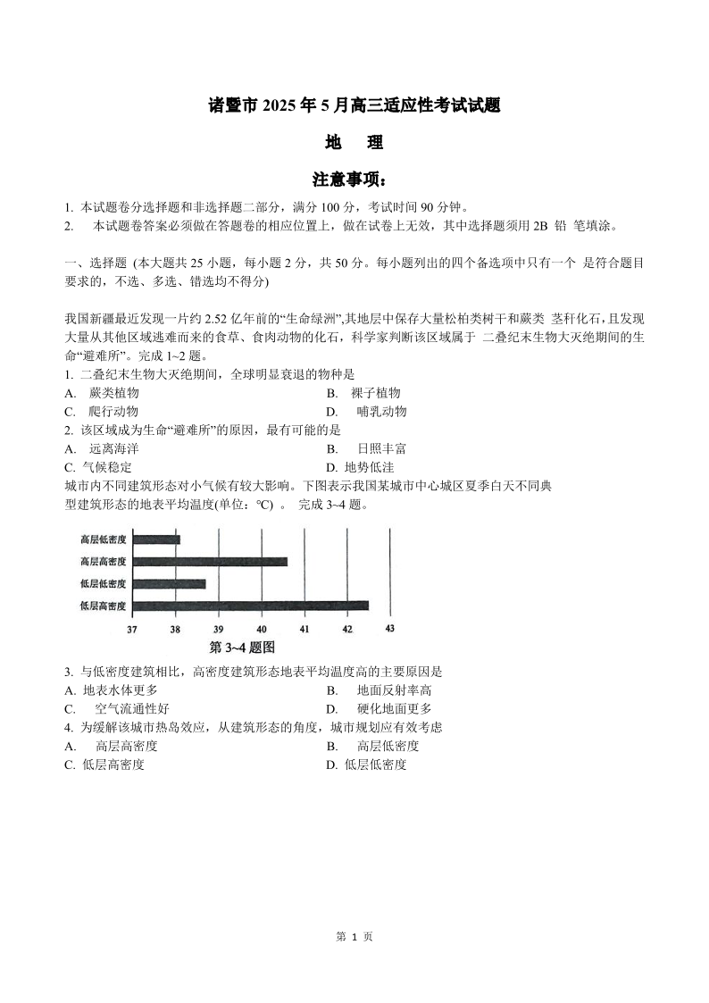 浙江省诸暨市2025年5月高三适应性考试地理