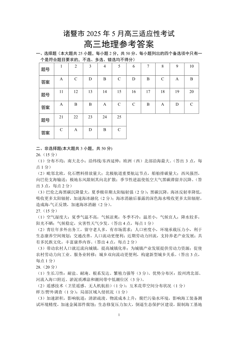 浙江省诸暨市2025年5月高三适应性考试地理答案