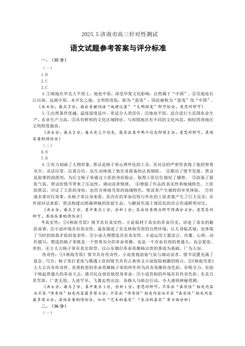 山东省济南市2025届高三5月高三针对性训练(三模)语文答案