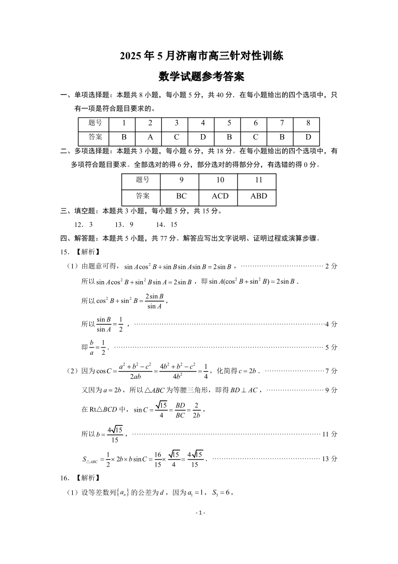 山东省济南市2025届高三5月高三针对性训练(三模)数学答案