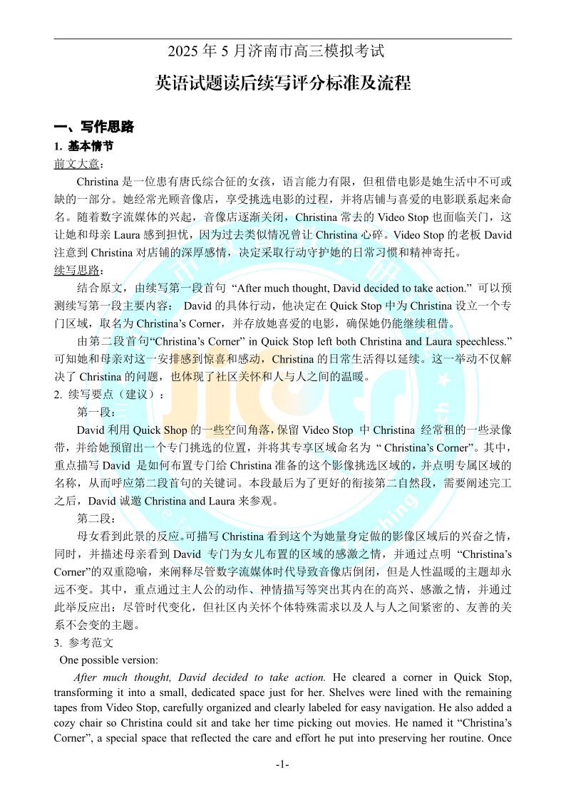 山东省济南市2025届高三5月高三针对性训练(三模)英语读后续写评分标准
