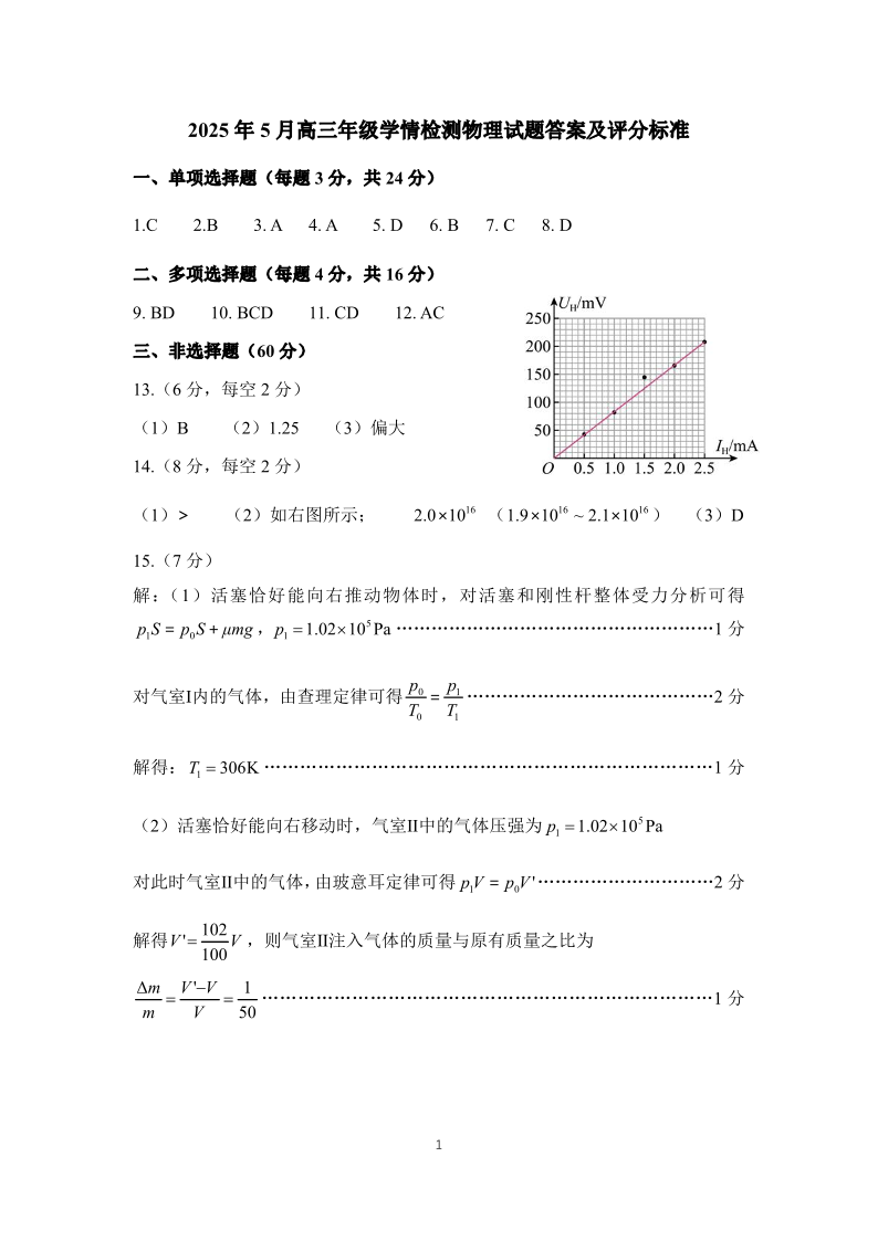山东省济南市2025届高三5月高三针对性训练(三模)物理答案及评分标准