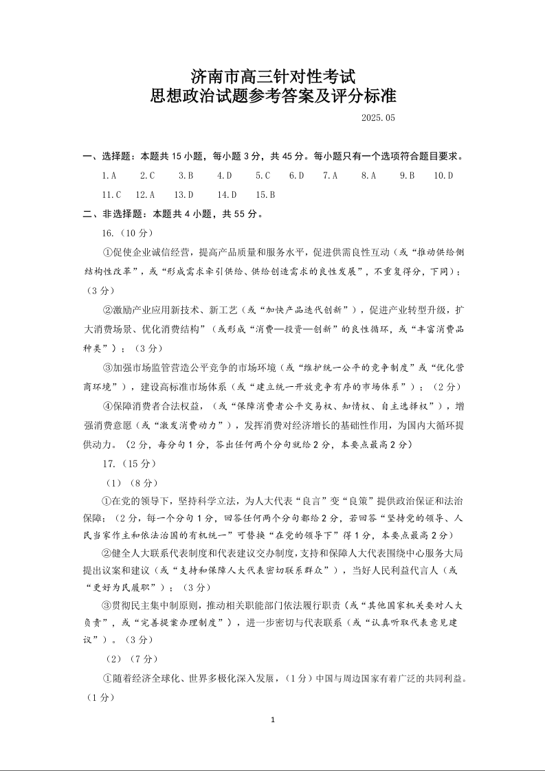 山东省济南市2025届高三5月高三针对性训练(三模)政治答案及评分细则