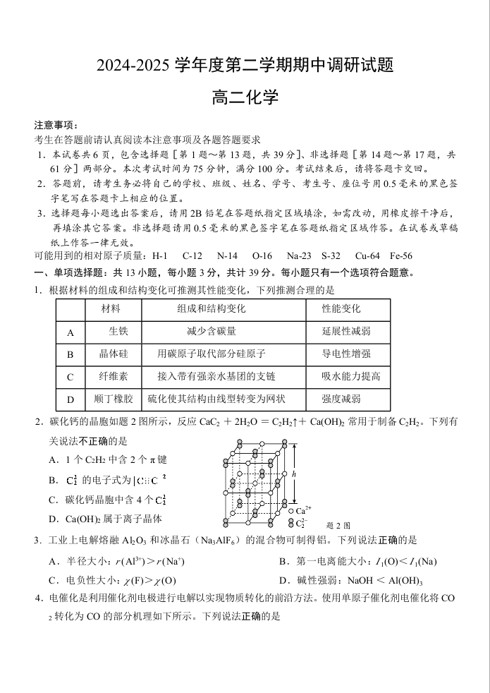 江苏省扬州市邗江区2024-2025学年下学期高二期中考试化学+答案