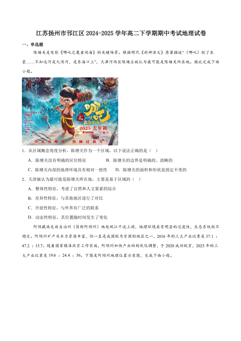江苏省扬州市邗江区2024-2025学年下学期高二期中考试地理+答案