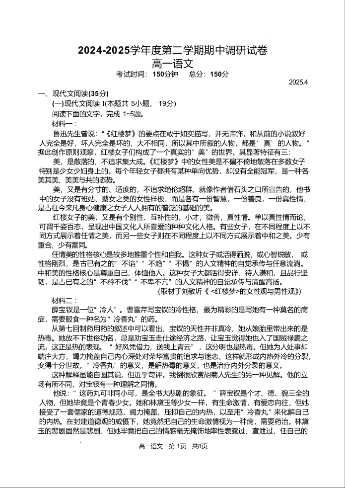江苏省扬州市邗江区2024-2025学年下学期高一期中考试语文+答案