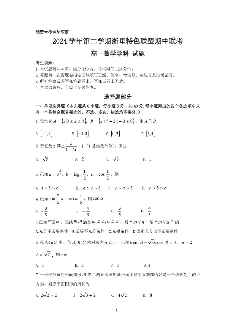 浙江省浙里特色联盟2024-2025学年高一下学期4月期中联考数学+答案